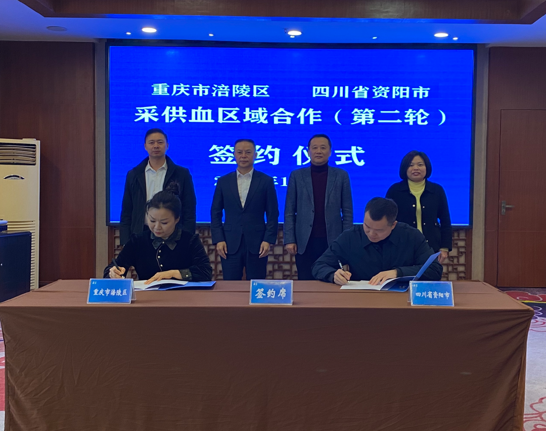 2024年1月23日,重庆市涪陵区、四川省资阳市采供血区域合作(第二轮)签约仪式在资阳市举行。涪陵区政府副区长郑小平、资阳市政府副市长罗道坤出席签约仪式并讲话,涪陵区政府办公室分管领导秦川,资阳市卫生健康委党组书记、主任欧阳曦,党组成员、副主任文帮芬,涪陵区卫生健康委党委委员、副主任洪亮以及涪陵区卫生健康委、资阳市卫生健康委、涪陵区中心血站、资阳市中心血站有关负责同志参加会议。会议由资阳市政府副秘书长李旭东主持。